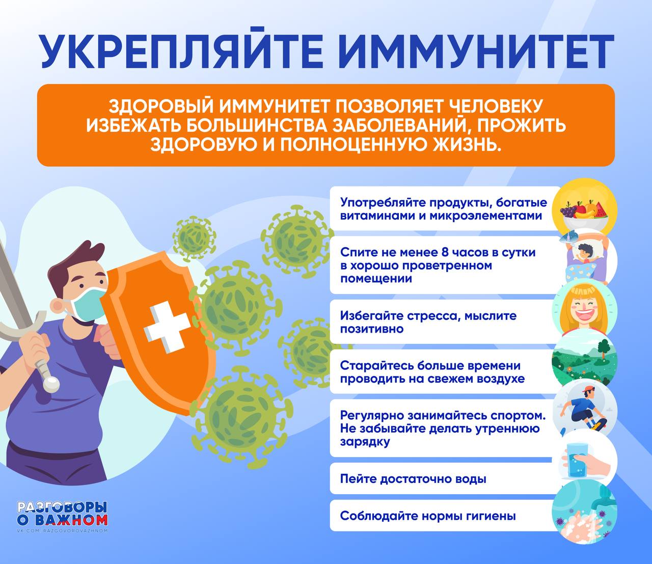 Кроме этого необходимо знать, что важное значение в профилактике гриппа и других острых респираторных инфекций имеют и неспецифические средства профилактики , к которым относятся прогулки на свежем воздухе, занятия физкультурой, недопущение переохлаждения организма, полноценное витаминизированное питание.