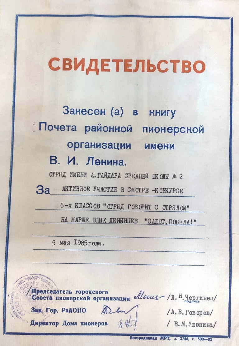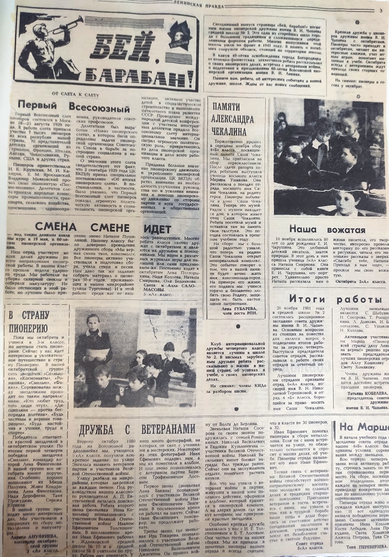 Принимали в пионеры с школьников с десяти лет — самых активных и достойных. Пионерская дружина носила имя В.И.Чапаева. Дружина состояла из пионерских отрядов. Каждый отряд доказывал своими делами, что достоин носить имя пионера-героя.