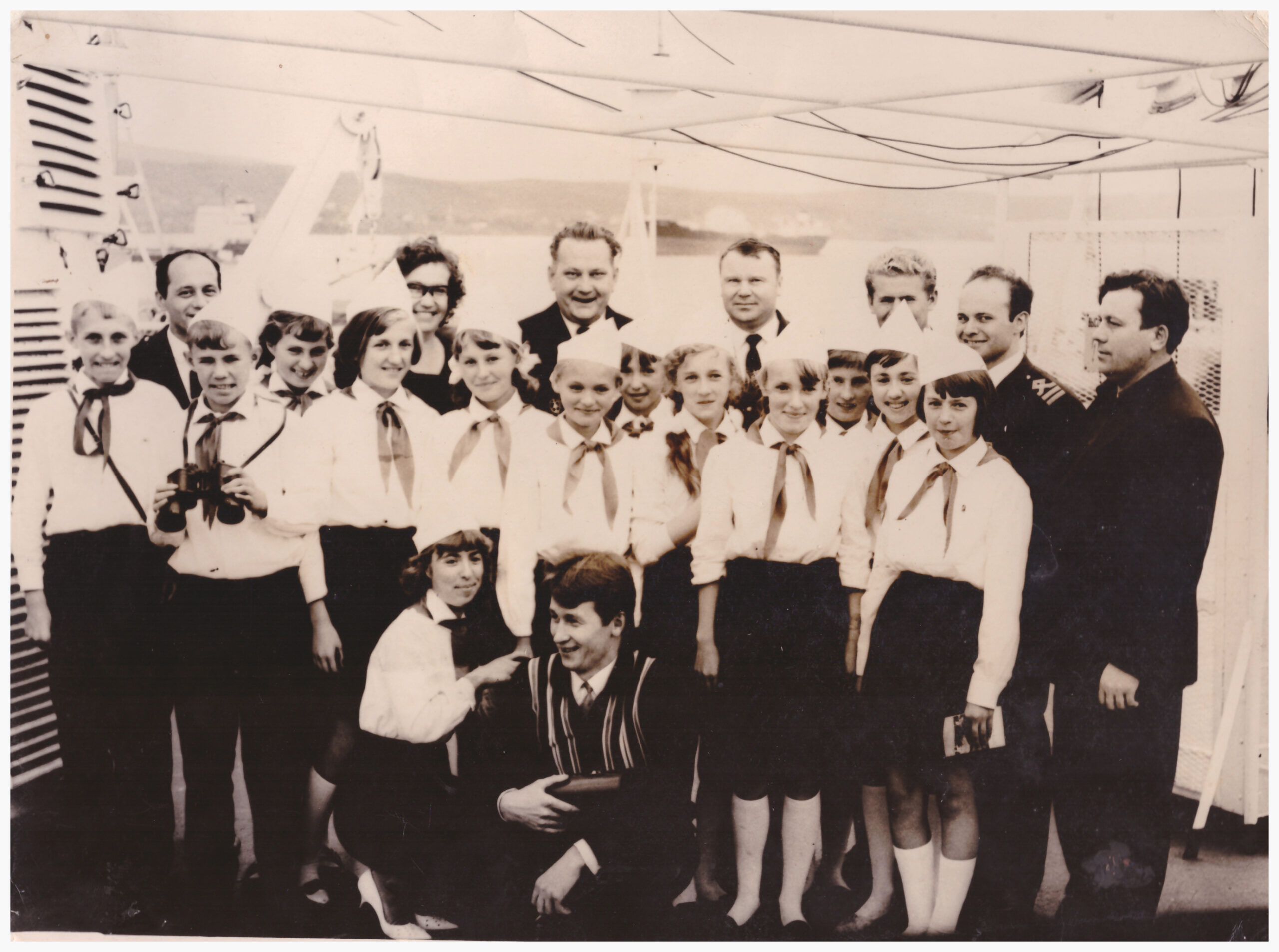 4. Одним из первых пионерских отрядов носил имя земляка Н.А. Островского пионера-героя Вали Котика. Ребята вели активную переписку с командой теплохода «Валя Котик». На фото пионеры встречаются с командой на верхней палубе теплохода.