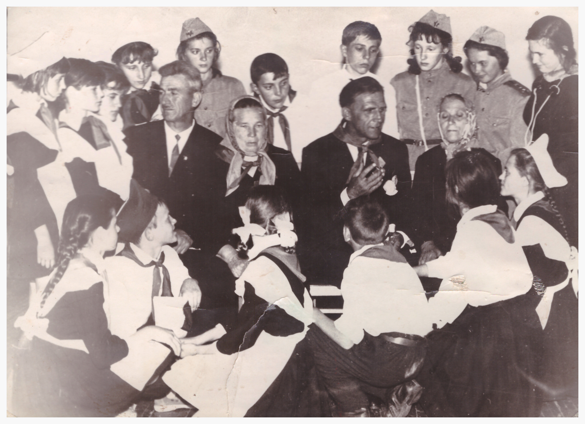 1. Встреча пионеров с партизанами из отряда, в котором воевал Валя Котик.
