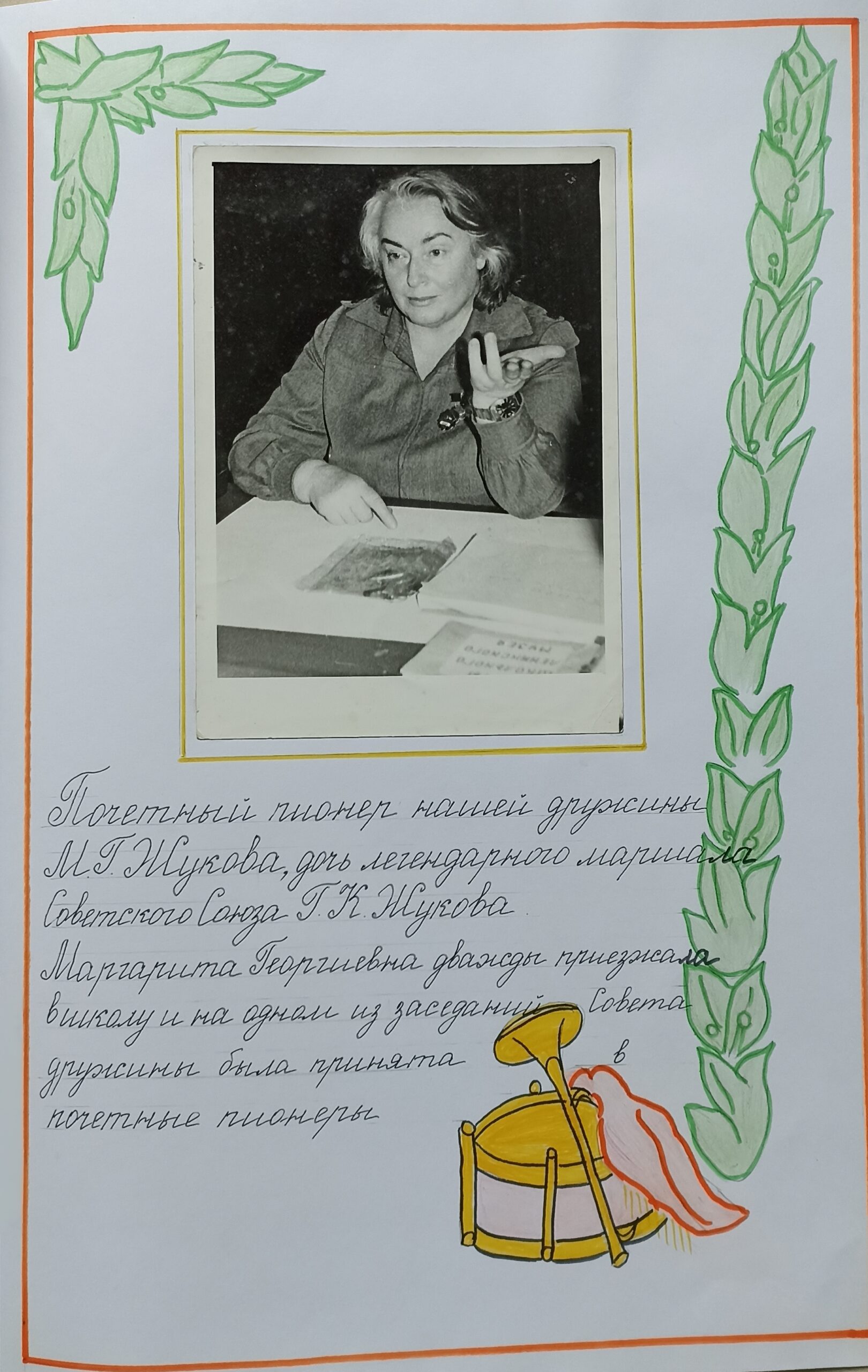 2. Фрагмент рукописной книги истории пионерской дружины им. Н.А. Островского с портретом гостьи школы и почетного пионера дружины им. Н.А. Островского Жуковой Маргариты Георгиевны.