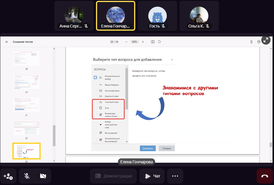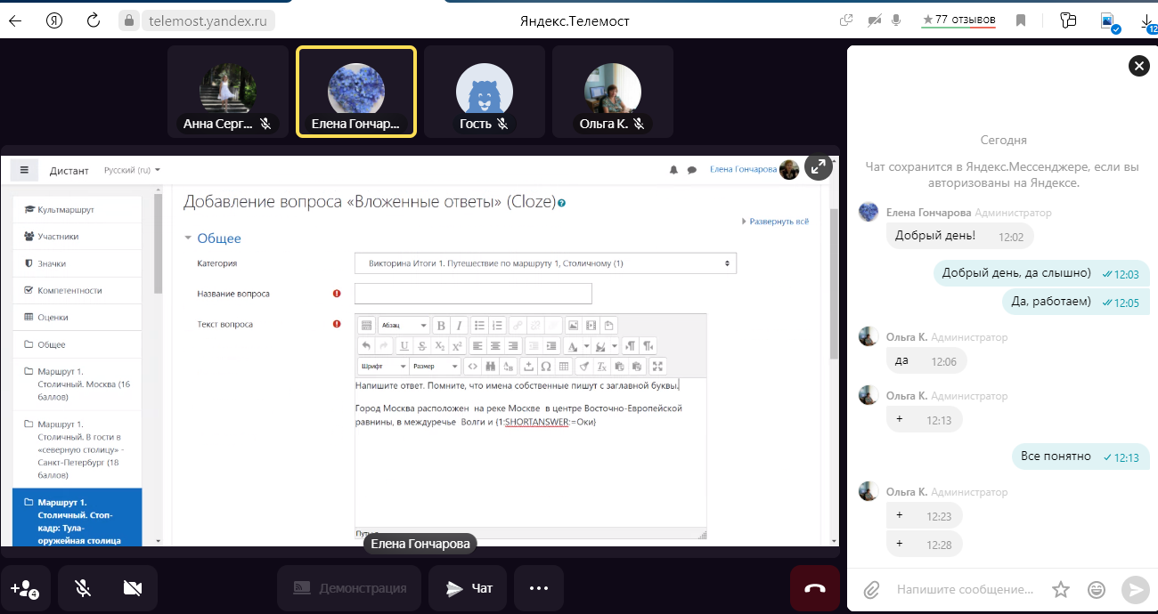 19 апреля состоялась очередная встреча творческой группы педагогов из отделений ГОУ ДО ТО «ЦДОД», работающих над созданием электронных курсов на базе Moodle . Тема видео-встречи — создание виртуального контента ( создание различных по типу вопросов, тестов, создание интерактивного квеста)