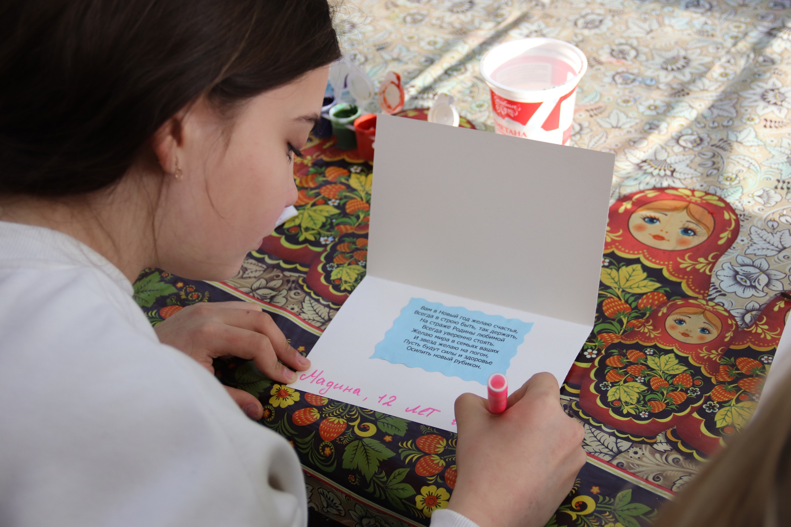 Перед Новым годом каждый ребенок смог подготовить поздравления военнослужащим, выполняющим боевые задачи. Ребята, вместе с родителями, готовили поздравительные открытки. Активисты РДШ Тульской области размещали свои поздравления в региональном сообществе движения ВКонтакте. Для участников итогового мероприятия были организованы мастер-классы по изготовлению открыток, творческие номера обучающихся Центра дополнительного образования детей. Открытки, сделанные ребятами, переданы участнику специальной военной операции для вручения нашим защитникам.