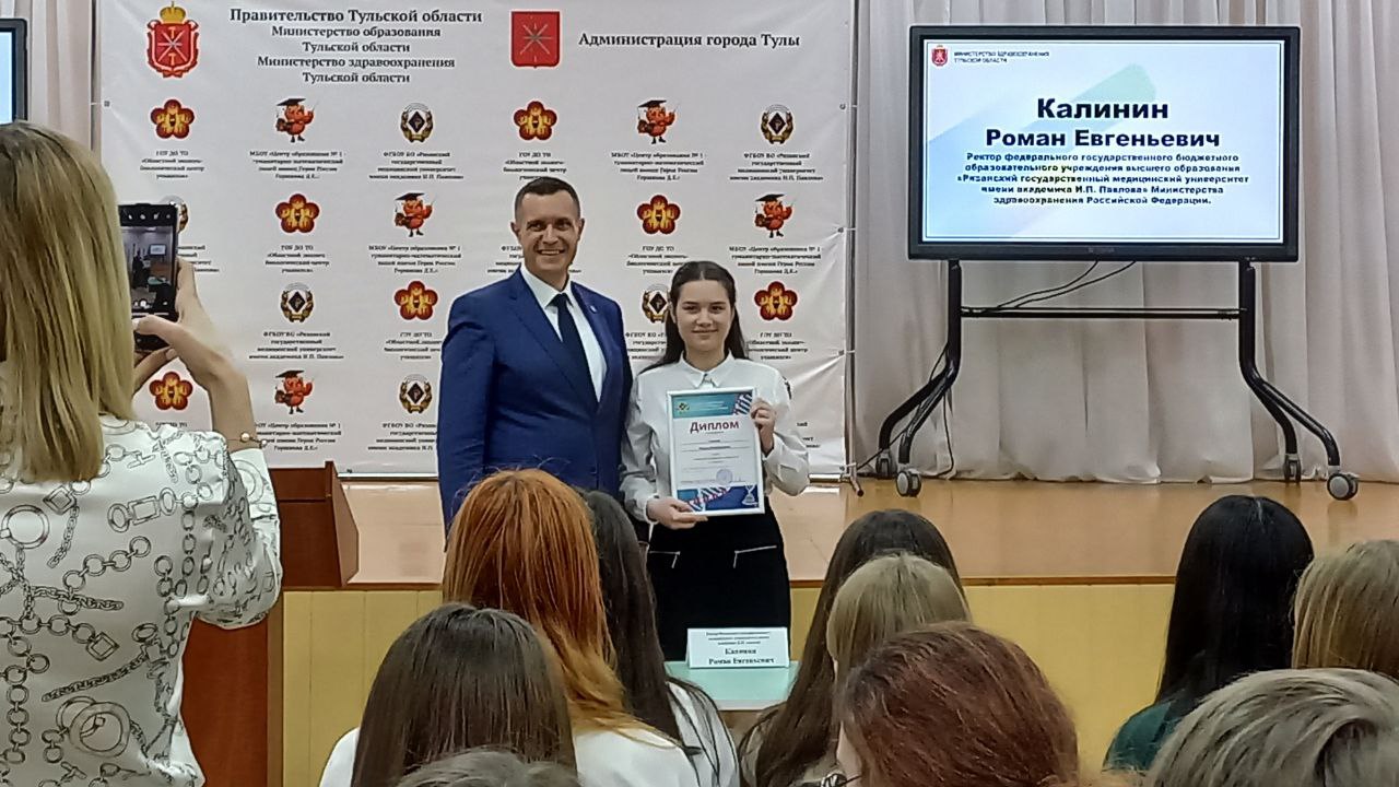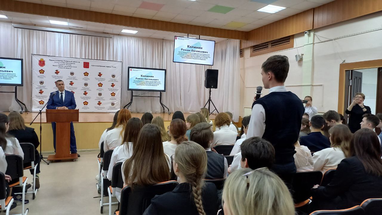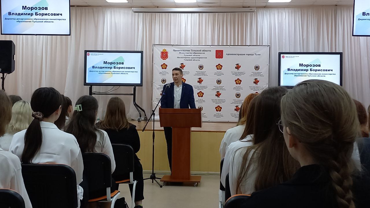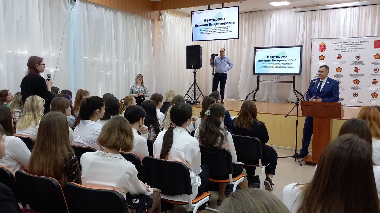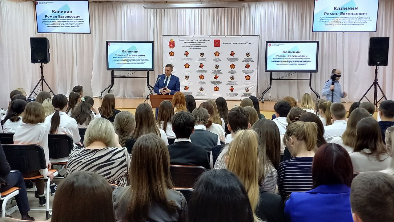 18 марта 2023 года на базе МБОУ «Центр образования № 1 — гуманитарно математический лицей имени Героя России Горшкова Д.Е.» состоялась встреча обучающихся Тульской областной медицинской школы с директором департамента министерства образования Тульской области – Морозовым Владимиром Борисовичем, главным консультантом отдела кадровой работы и обеспечения деятельности департамента кадровой работы и проектной деятельности министерства здравоохранения Тульской области — Нестеровой Евгенией Владимировной, ректором ФГБОУ ВО «Рязанский государственный медицинский университет имени академика И.П. Павлова» — Калининым Романом Евгеньевичем.