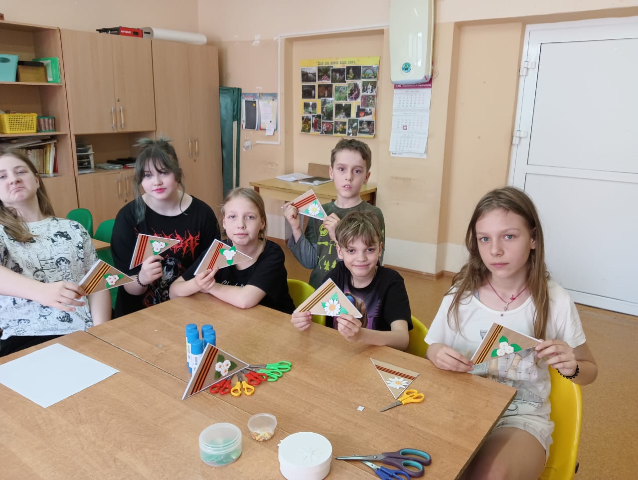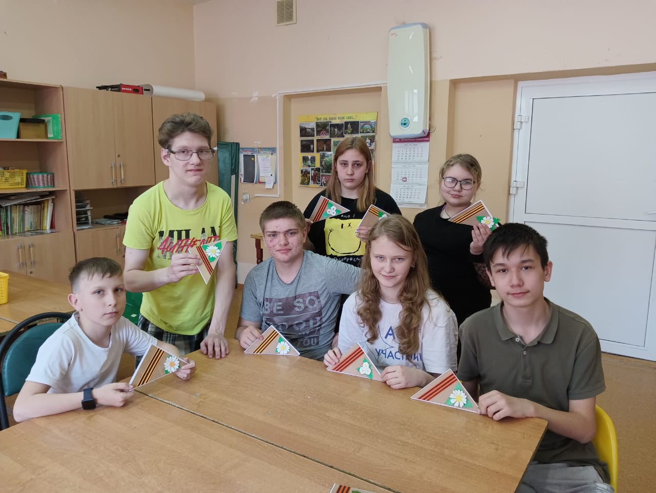 в технике оригами и декорировать ее в технике кардмейкинг. Ребята с удовольствием подготовили праздничные открытки, написали поздравления и украсили их главным символом Победы — георгиевской лентой.
