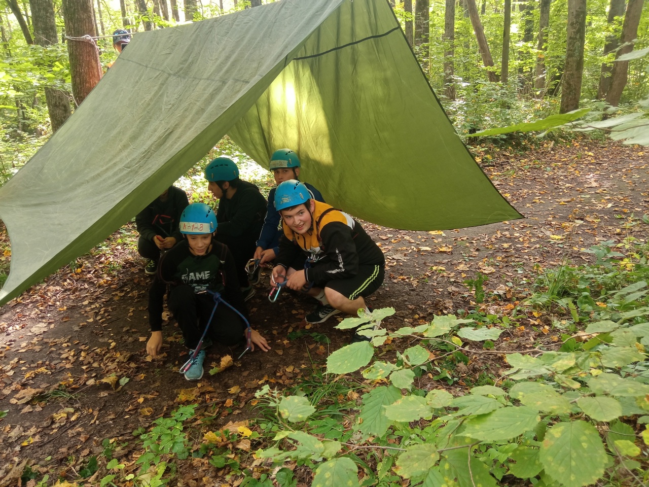 - комбинированный туристический маршрут, переправлялись по параллельным периллам, преодолели траверс, перешли овраг по бревну с опорой на альпеншток, натянули тент и командой укрылись под ним;