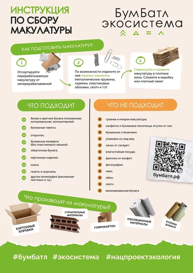 Регистрируйтесь на сайте бумбатл.рф и до 15 ноября приносите бумагу и картон в ближайший пункт сдачи вторсырья. Все участники получат призы! А также выкладывайте фото в «Одноклассниках» и во «ВКонтакте» с хештегами #Бумбатл #экосистема #нацпроектэкология.