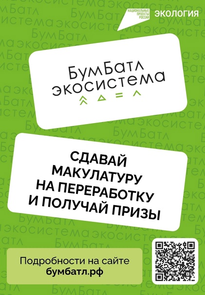 Регистрируйтесь на сайте бумбатл.рф и до 15 ноября приносите бумагу и картон в ближайший пункт сдачи вторсырья. Все участники получат призы! А также выкладывайте фото в «Одноклассниках» и во «ВКонтакте» с хештегами #Бумбатл #экосистема #нацпроектэкология.