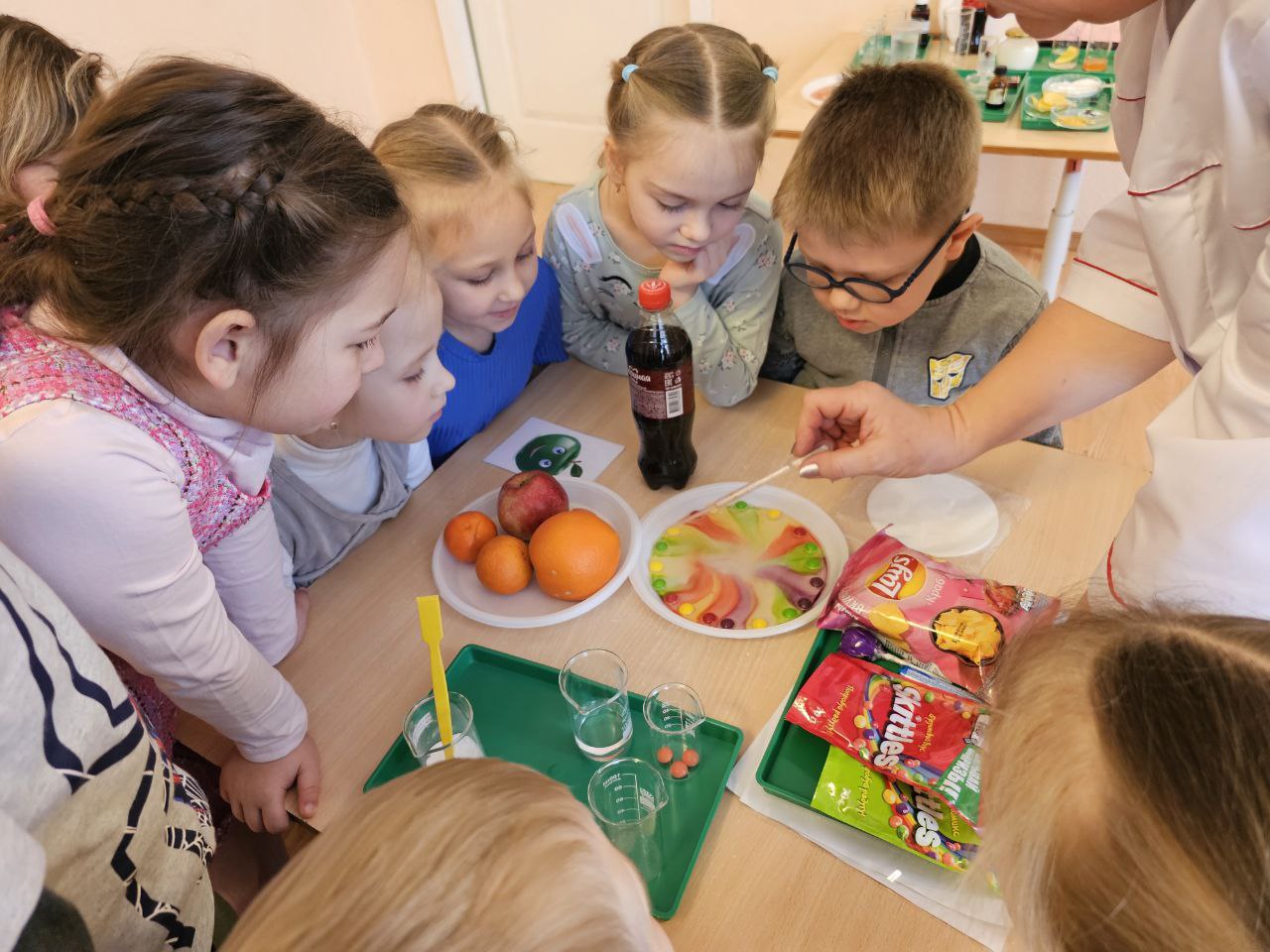 В импровизированной пищевой лаборатории дети провели качественный анализ конфет «Скитлз» и картофельных чипсов, выяснив, что эти продукты содержат много красителей, масла, крахмала. Не все вкусное бывает полезным – к такому выводу пришли юные исследователи. Чтобы наше питание было здоровым, нужно есть побольше овощей и фруктов.