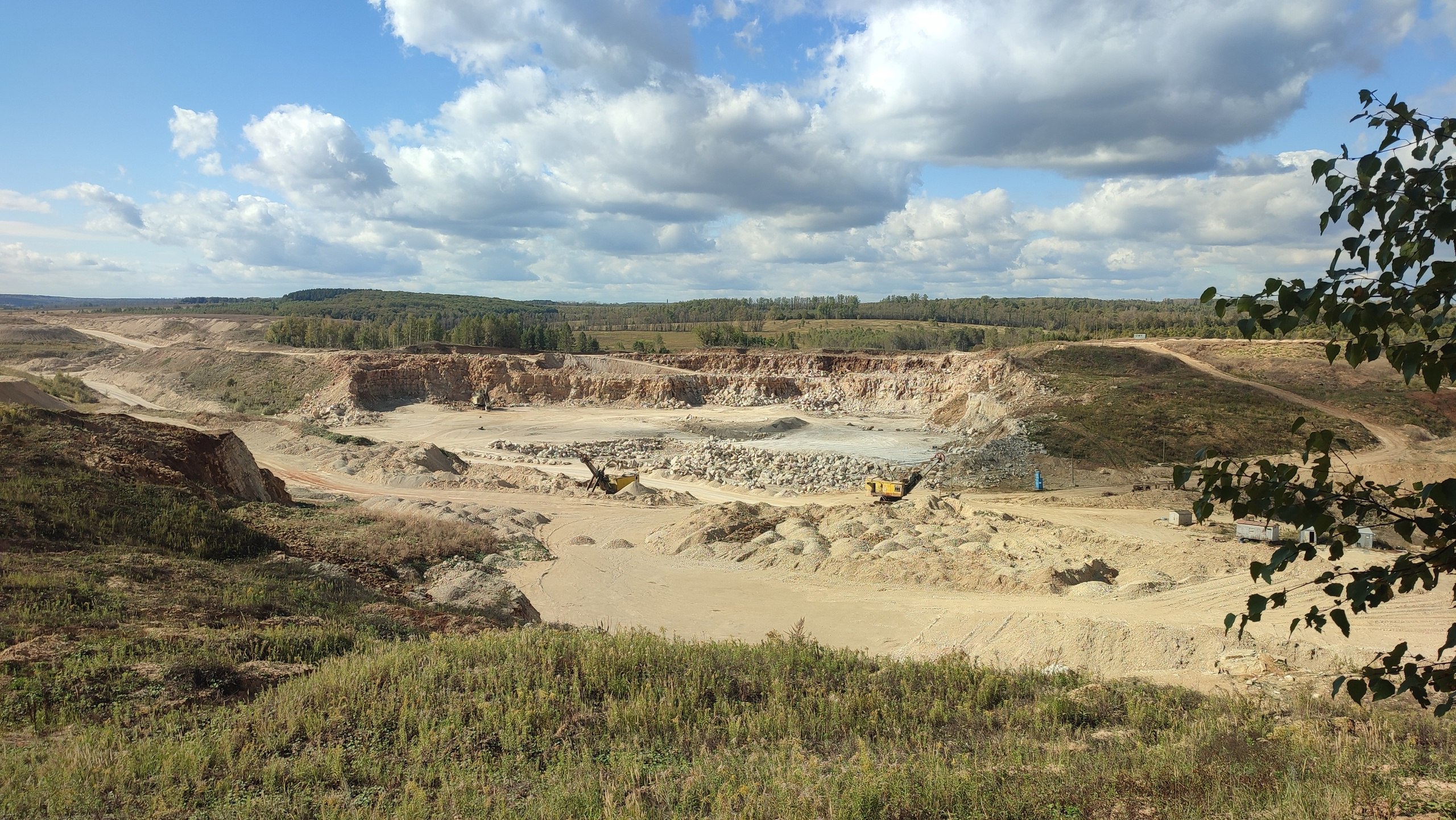 Сверху в карьер открывается необычный марсианский вид. Здесь добывают полезное ископаемое — известняк. Видны срезы грунта, слоистость.