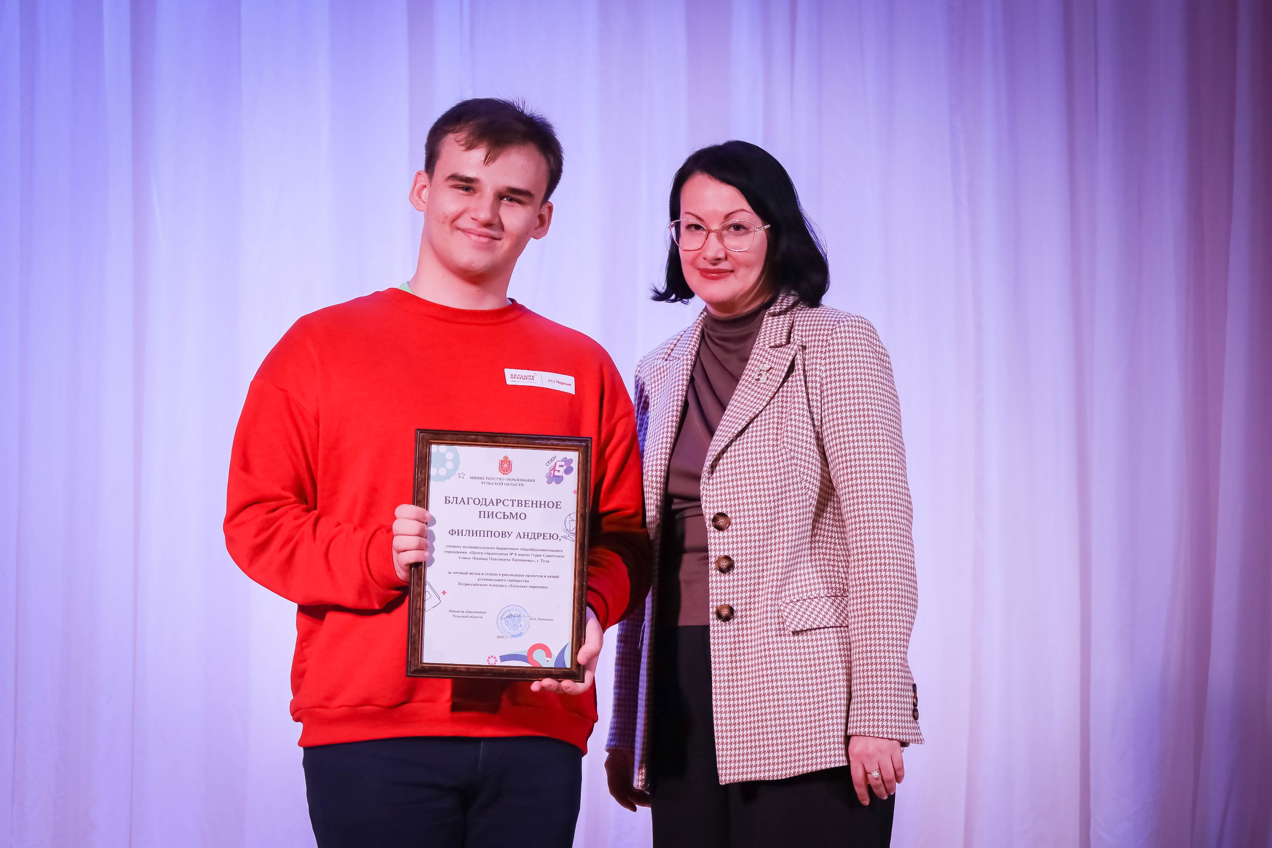 С приветственным словом к ребятам и наставникам обратилась заместитель министра образования Тульской области Сорокина Людмила Юрьевна, поблагодарила за активное участие и вручила почётные грамоты педагогам-наставникам и победителям 5 сезона Всероссийского конкурса «Большая перемена».