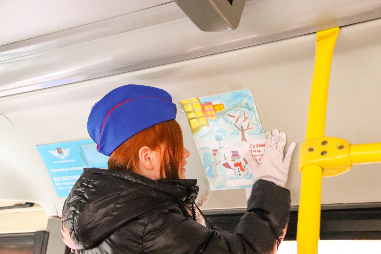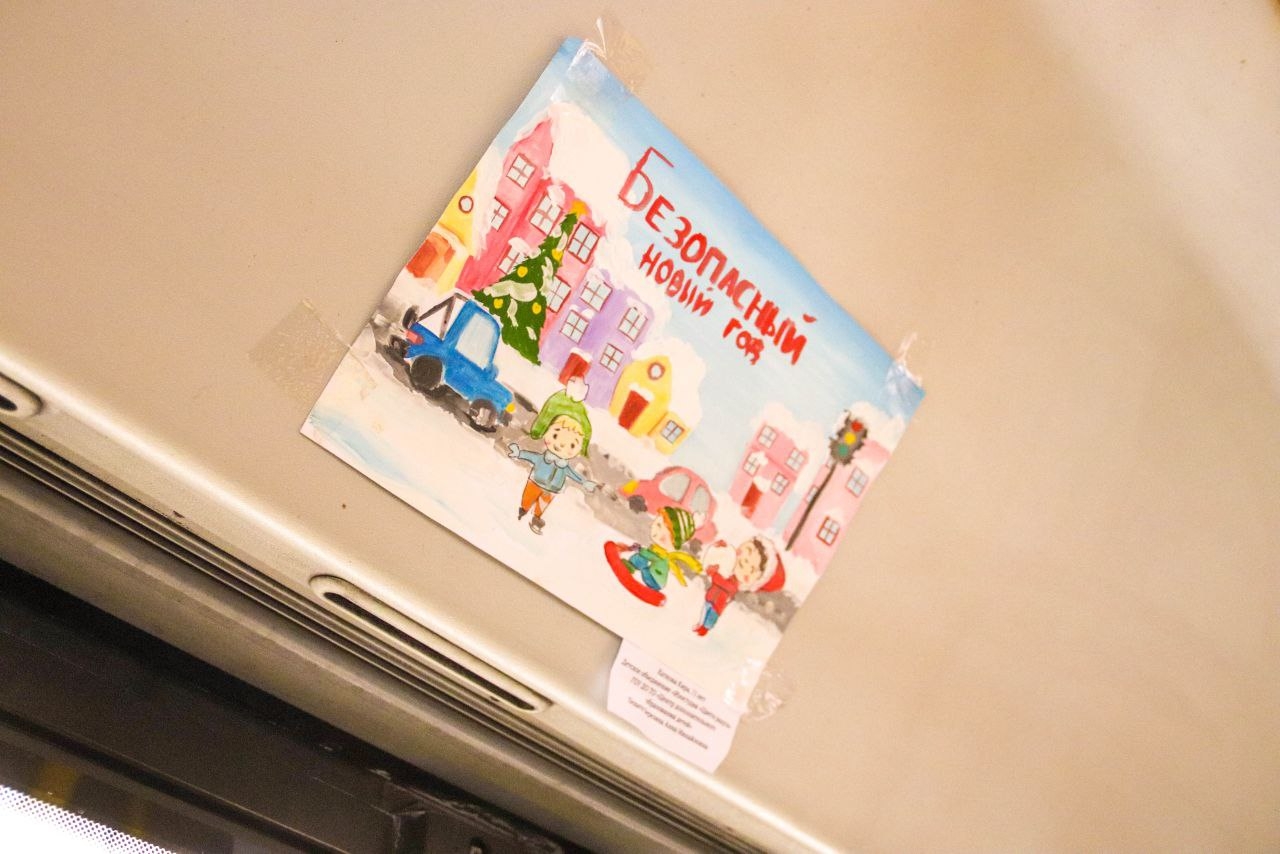 В рамках областной акции «Новый год без ДТП» ребята украсили салон новогодними поделками и развесили рисунки на тему безопасности дорожного движения. Обычный транспорт превратился в настоящую передвижную сказку и яркий социальный проект.