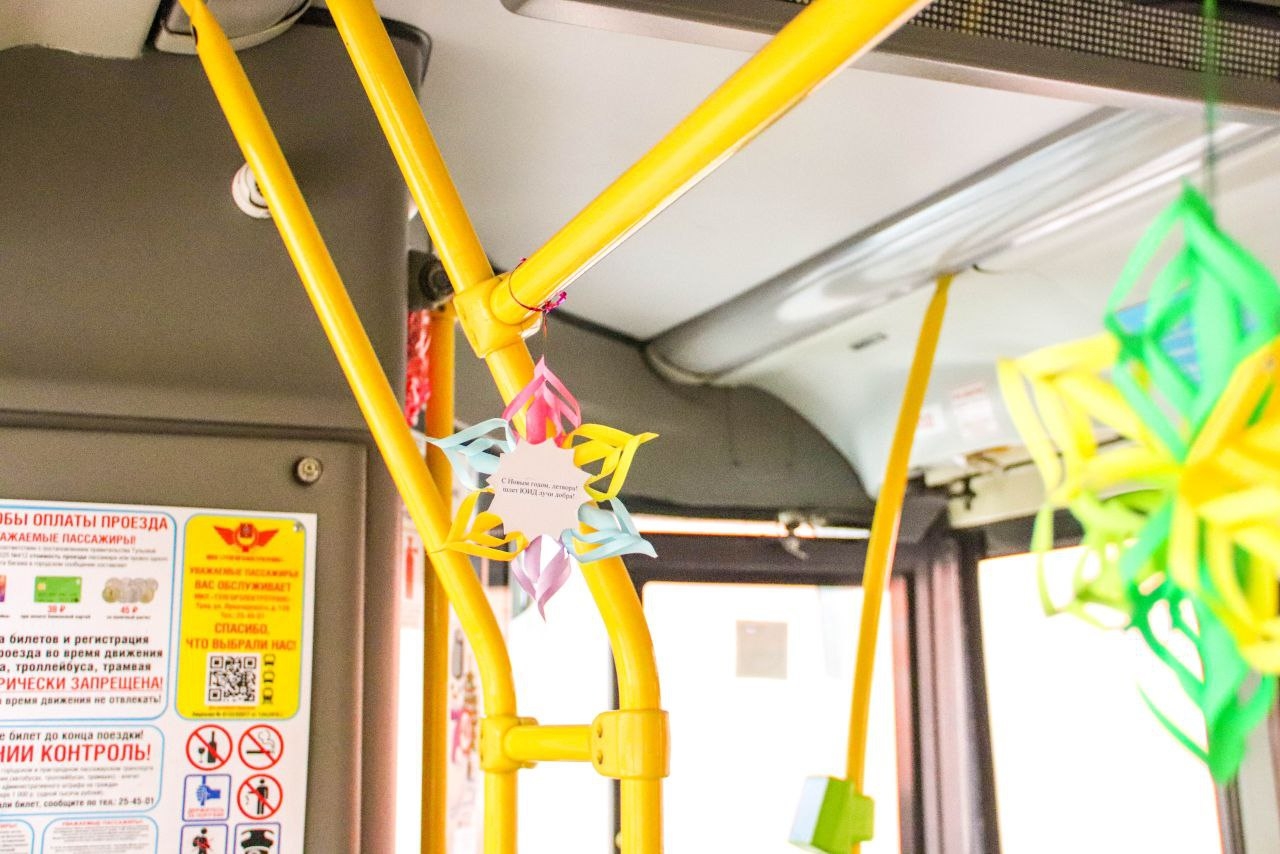Сегодня активисты отрядов Юных инспекторов движения Тульской области — воспитанники Центра дополнительного образования детей вместе с Дедом Морозом и Снегурочкой преобразили городской автобус.