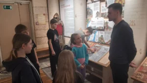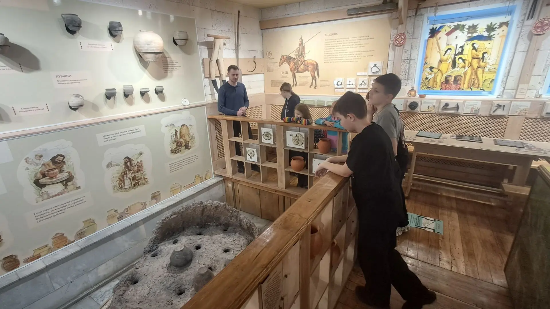 Затем детям показали убранство традиционной русской избы и познакомили с бытом тульской семьи XVII-XVIII веков. Обучающиеся участвовали в интерактивных играх: выбирали «хозяина» и «хозяйку» избы, делали поклон