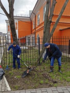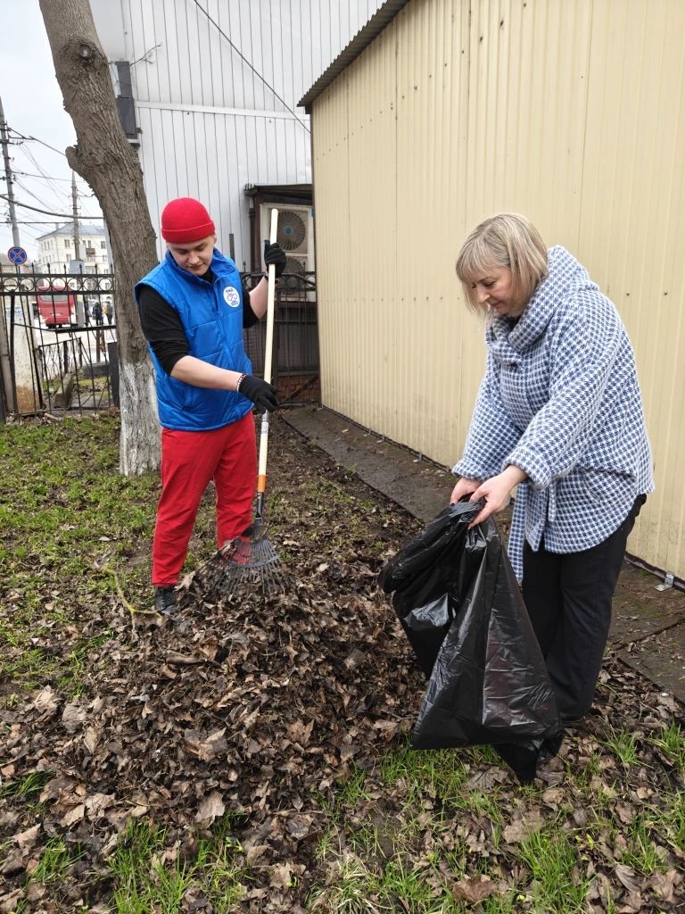 В ходе субботника сотрудники привели в порядок здание, собрали накопившийся за зиму мусор и очистили газоны от прошлогодних листьев.